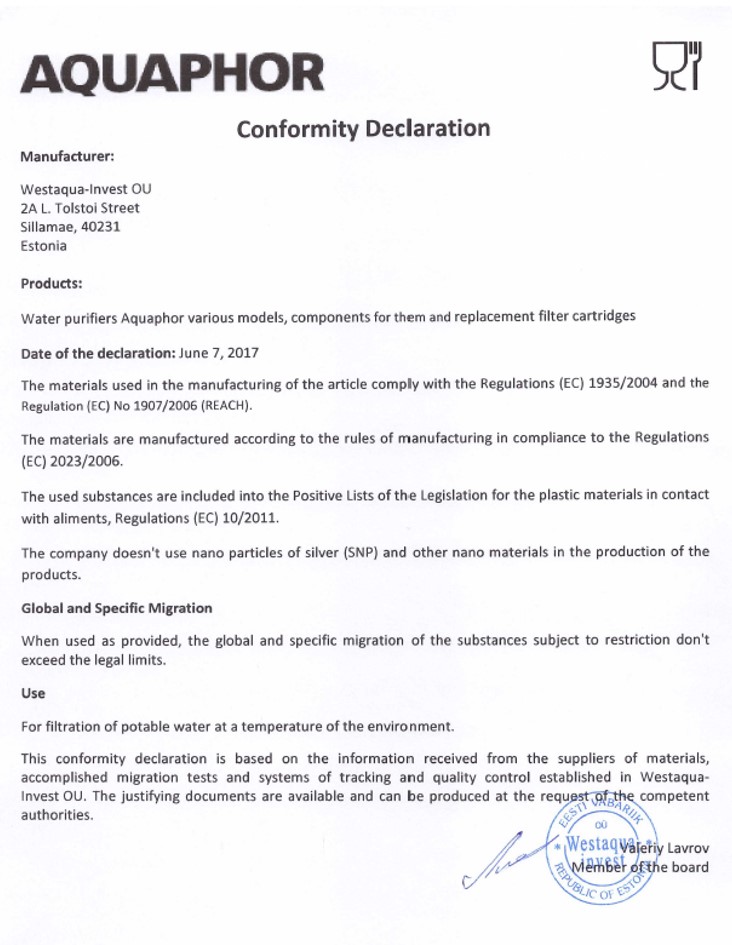 Declaration of conformity of Aquaphor Filter.jpg Download